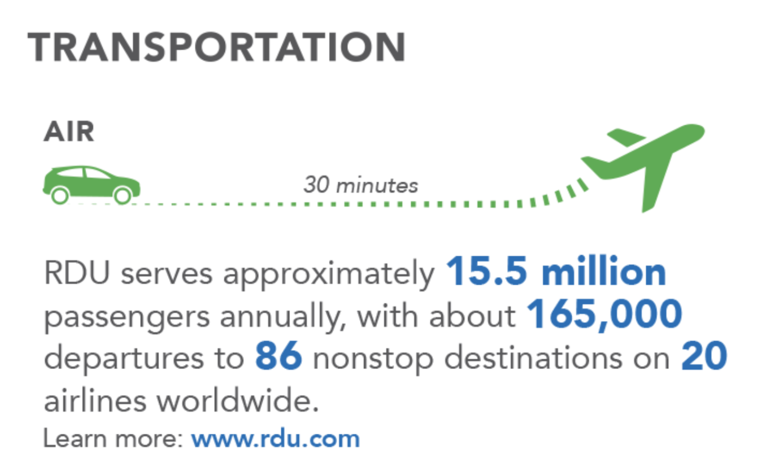 Raleigh-Durham International Airport (RDU) is 22 miles from downtown Wake Forest and home to 11 major airlines, flying to 36 nonstop destinations on 400+ daily flights. Select Tech Hubs and International Flights include: